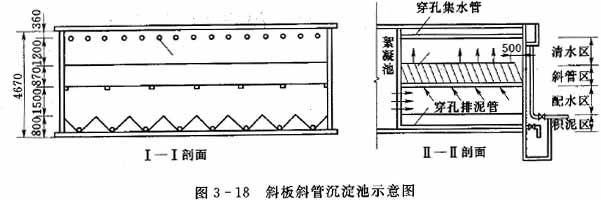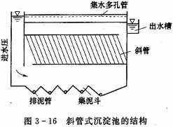 斜管斜板式沉淀池的結構與一般沉淀池相同,是由進口、沉淀區(qū)、出口與集泥區(qū)四個部分組成,只是在沉淀區(qū)設置有許多斜管或斜板。圖3-16為斜管式沉淀池的典型結構。