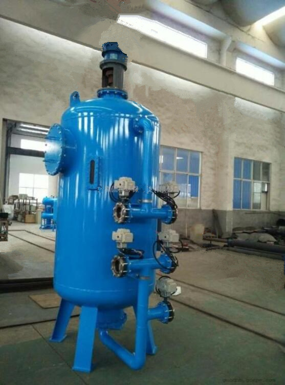 該型過濾器過濾時(shí)濾液高進(jìn)低出,反洗時(shí)反洗 水低進(jìn)高出,反洗水不間斷,清水消耗量大;攪拌 槳葉采用標(biāo)準(zhǔn)直葉片或斜葉片,對(duì)濾料傷害大,槳 葉一般不反轉(zhuǎn),使纖維球和水流同向旋轉(zhuǎn)運(yùn)動(dòng),導(dǎo)致反洗水對(duì)濾料沖洗力不大,濾料不易洗凈。